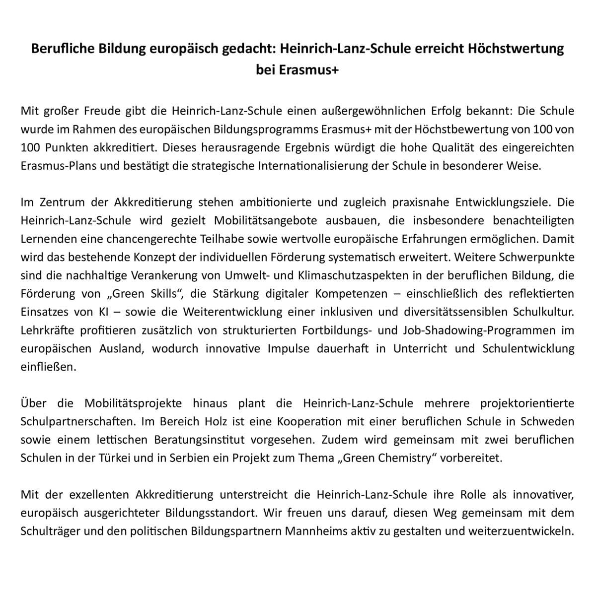 Heinrich-Lanz-Schule erreicht Höchstwertung bei Erasmus+Heinrich-Lanz-Schule100 von 100 Punkten: Heinrich-Lanz-Schule setzt europäische Maßstäbe mit Erasmus+Aktuelles - 02/26/2026