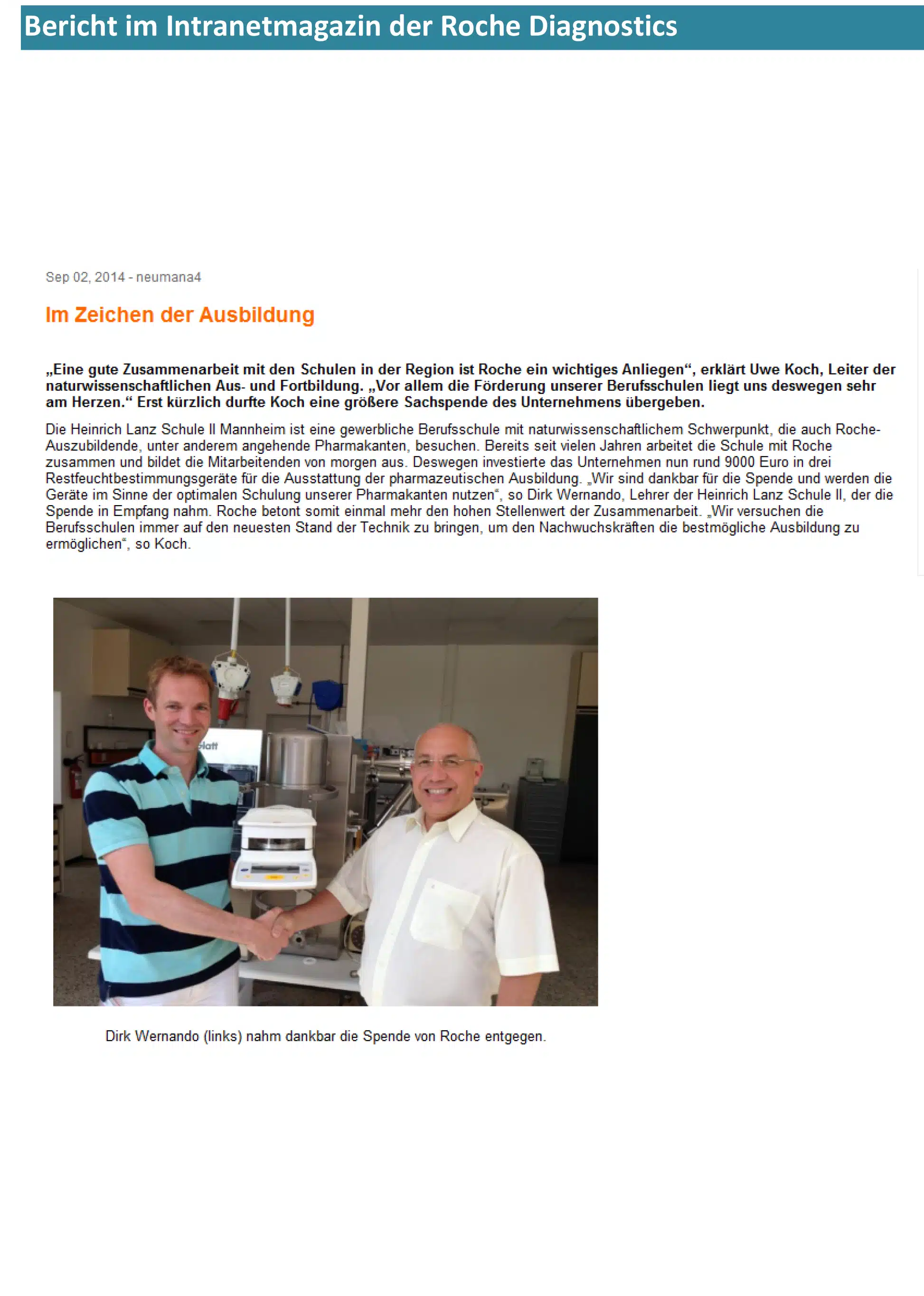 "Eine gute Zusammenarbeit mit denSchulen in der Region ist Roche ein wichtiges Anliegen", erklärt Uwe Koch, Leiter der Naturwissenschaftlicher Aus- und Fortbildung unserer Berufsschulen lieg uns deswegen sehr am Herzen." Erst kürzlich durfte Koch eine größere Sachspende des Unternehmens übergeben.