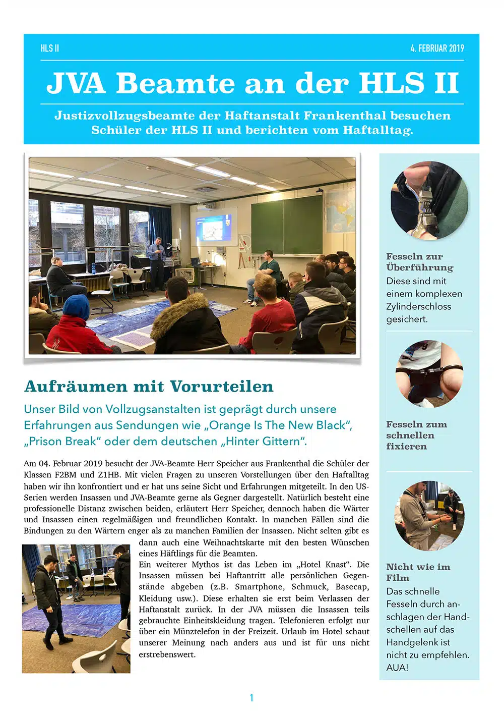 Am 04. Februar 2019 besucht der JVA-Beamte Herr Speicher aus Frankenthal die Schüler der Klassen F2BM und Z1HB. Mit vielen Fragen zu unseren Vorstellungen über den Haftalltag haben wir ihn konfrontiert und er hat uns seine Sicht und Erfahrungen mitgeteilt. In den US-Serien werden Insassen und JVA-Beamte gerne als Gegner dargestellt. Natürlich besteht eine professionelle Distanz zwischen beiden, erläutert Herr Speicher, dennoch haben die Wärter und Insassen einen regelmäßigen und freundlichen Kontakt....